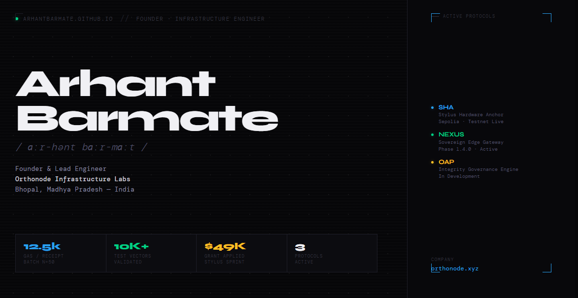 I build the trust primitives that decentralized systems cannot assume — deterministic hardware identity, tamper-evident execution receipts, and zero-trust edge gateways. Founder of Orthonode Systems™.